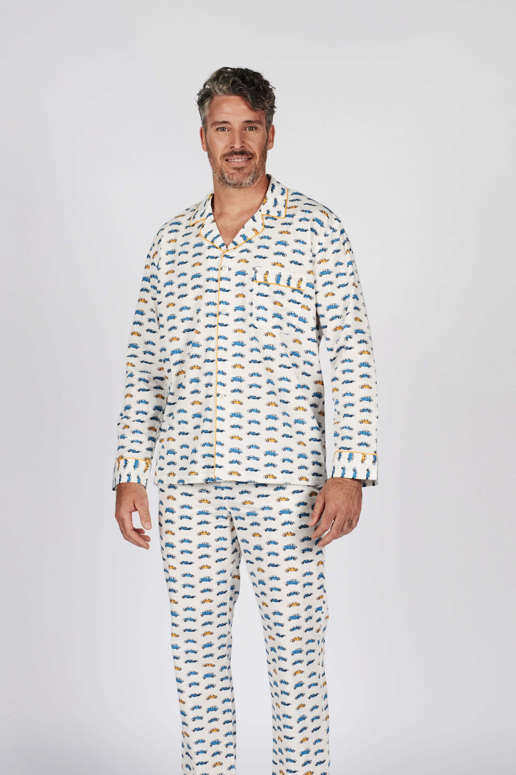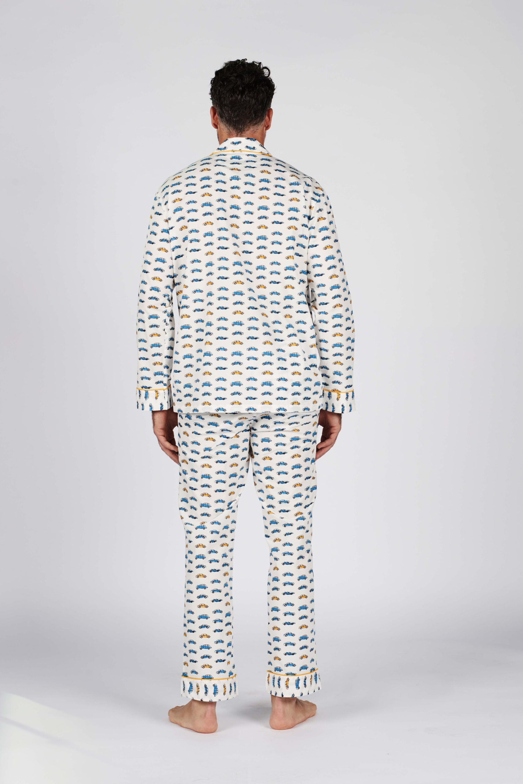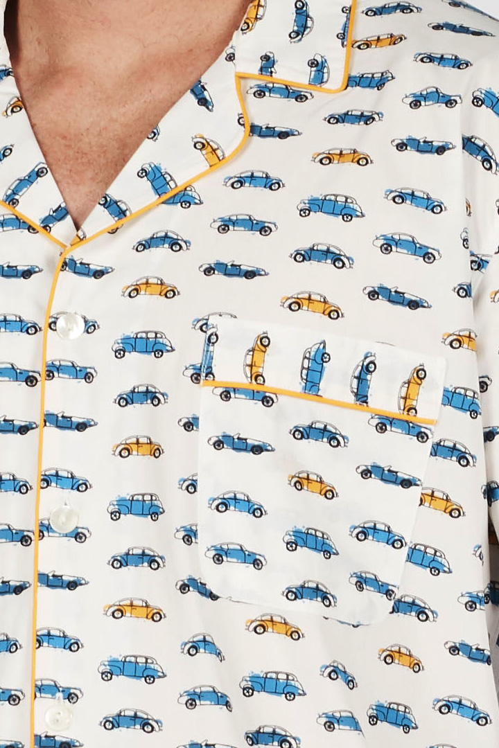 The exclusive car print of these pyjamas is enhanced by contrasting yellow piping on the collar, pocket, and hem, along with personalized mother-of-pearl buttons.