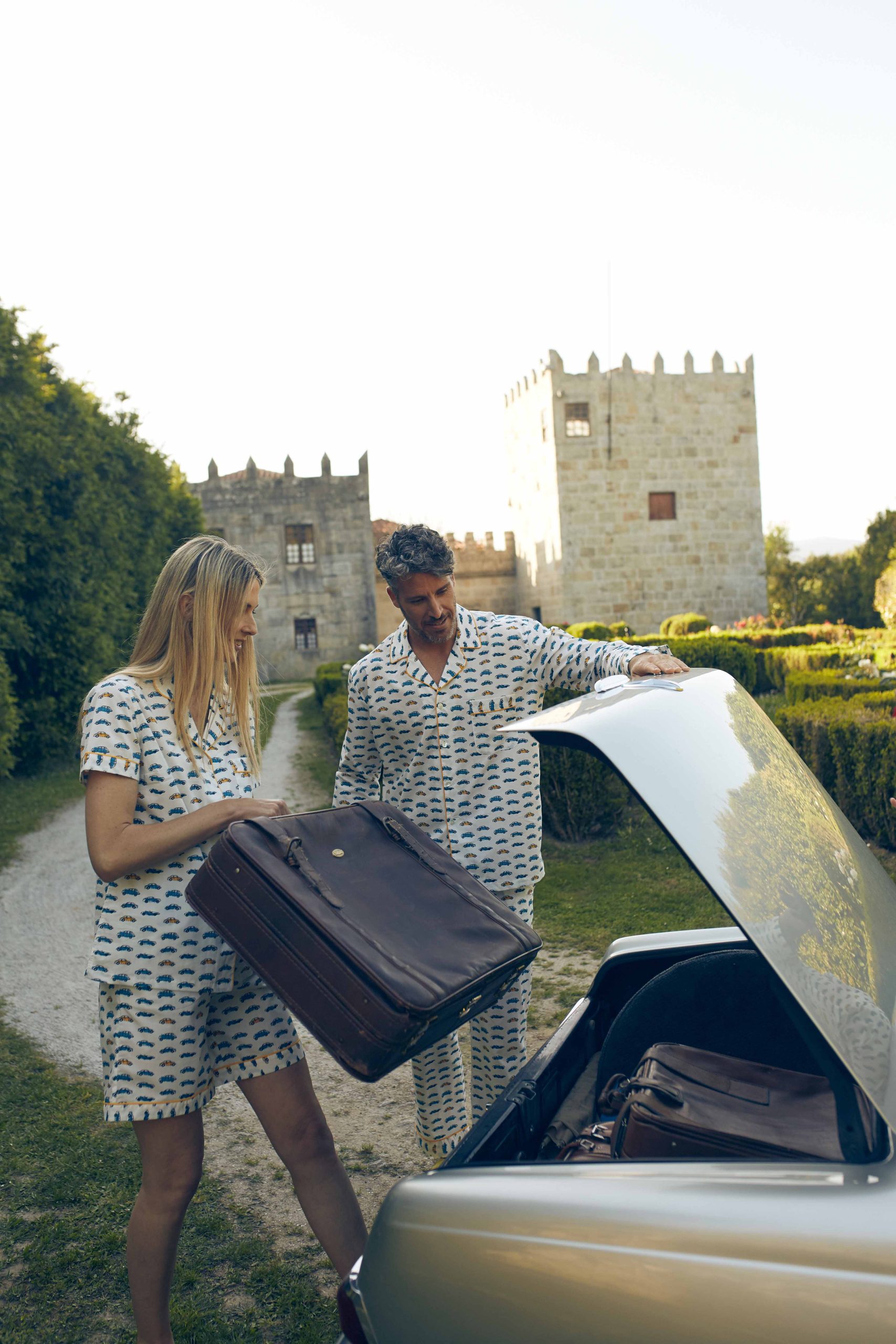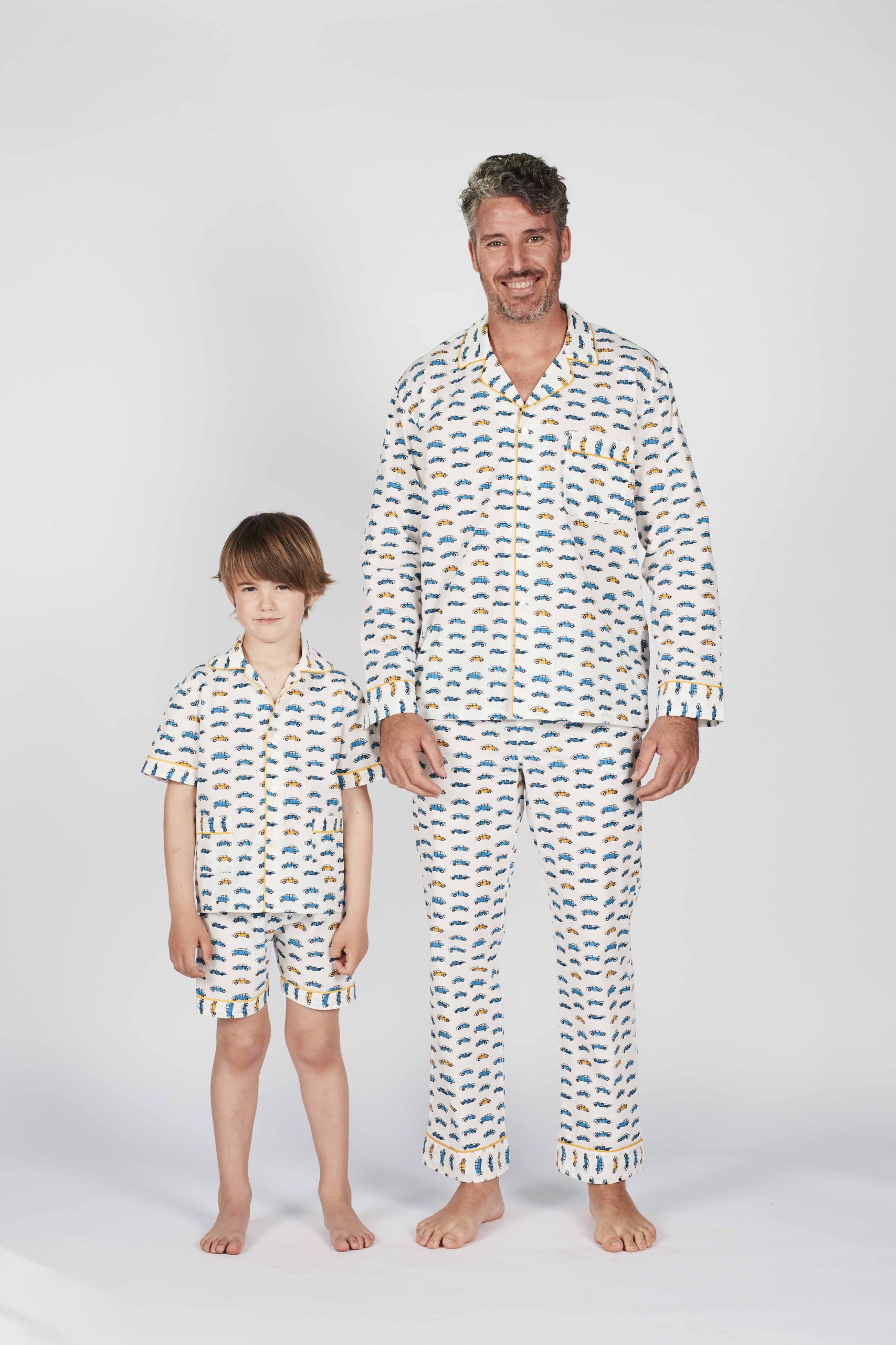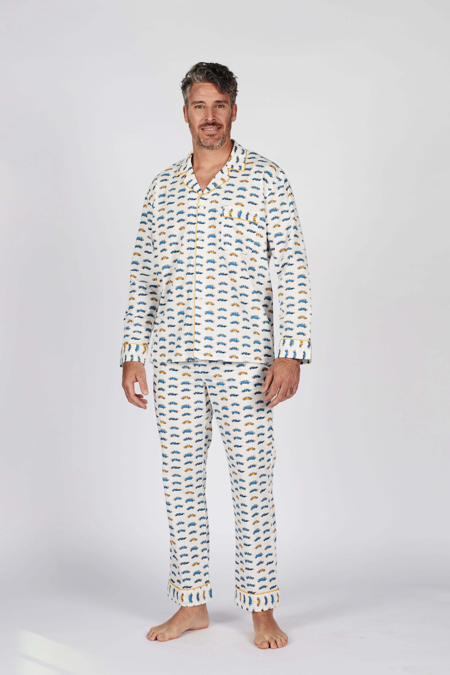 The exclusive car print of these pyjamas is enhanced by contrasting yellow piping on the collar, pocket, and hem, along with personalized mother-of-pearl buttons.