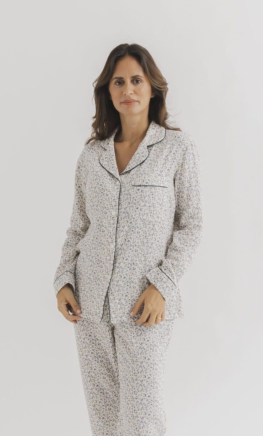 Wrap yourself in elegance and comfort with this 100% cotton mousseline pyjama, crafted in Portugal. The delicate, romantic floral print in blue and green tones is enhanced by elegant green piping along the collar, pocket, and hem, with personalized mother-of-pearl buttons for a refined finish.